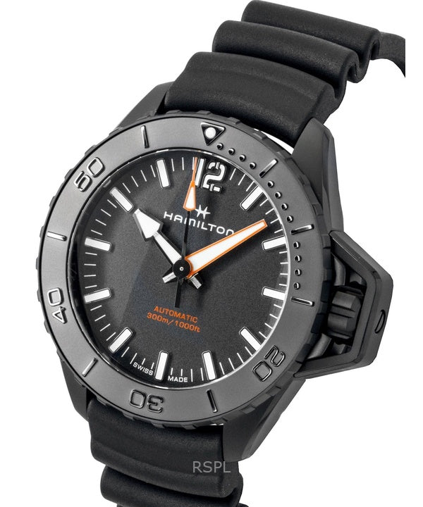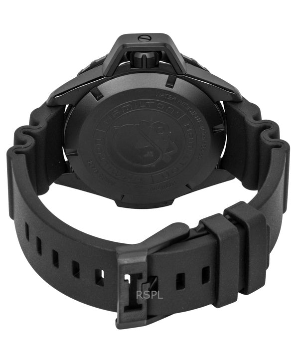 Orologio da uomo Hamilton Khaki Frogman con cinturino in gomma e quadrante nero, automatico, subacqueo, H77855330, 300 m