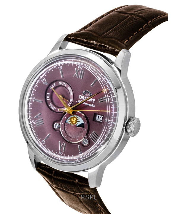 Orologio da uomo Orient Classic Sun and Moon con cinturino in pelle e quadrante Bordeaux, automatico RA-AK0807R